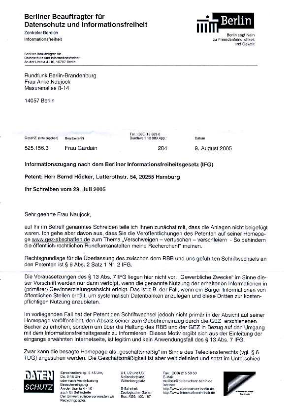 Auch die Antwort des Berliner Beauftragten für Datenschutz und Informationsfreiheit an den rbb liegt mir inzwischen vor: |