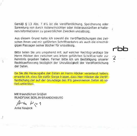 "Da Sie die Herausgabe der Daten an Herrn Höcker veranlasst haben, erwarte ich, dass Sie dafür Sorge tragen, dass Herr Höcker die Veröffentlichung der auf der Grundlage des IFG gewonnenen Daten ab sofort unterlässt." Anke Naujock, rbb |