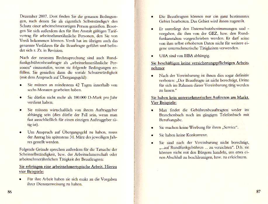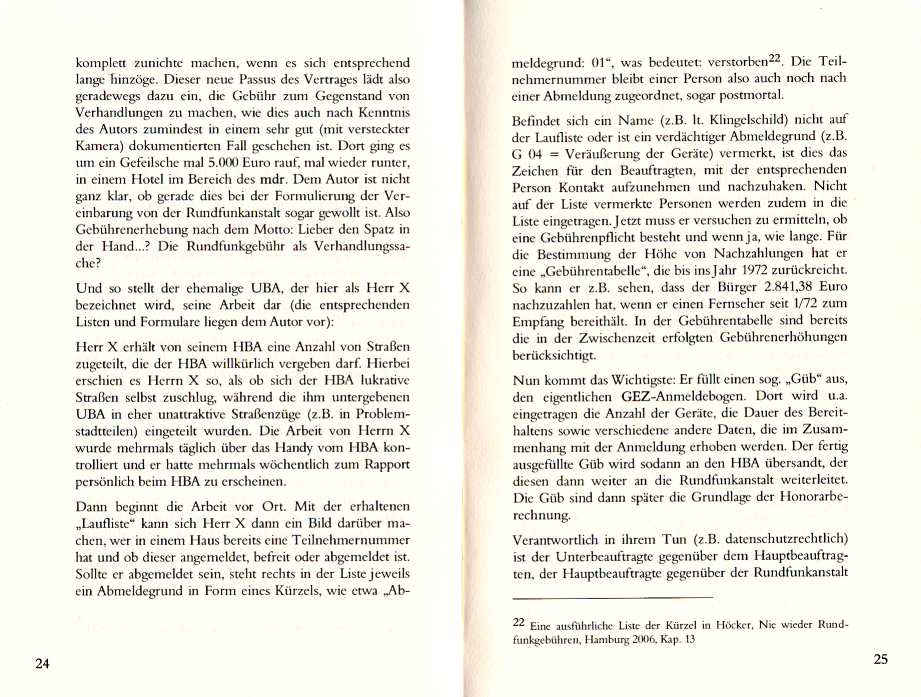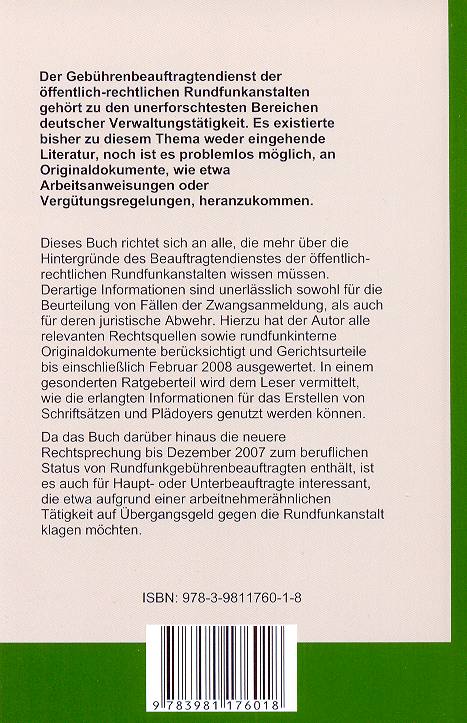 erhalten nur Geld, Dieses Buch richtet sich an alle, die mehr über die Hintergründe des Beauftragtendienstes der öffentlich-rechtlichen Rundfunkanstalten wissen müssen. Derartige Informationen sind unerlässlich sowohl für die Beurteilung von Fällen der Zwangsanmeldung, als auch für deren juristische Abwehr. Hierzu hat der Autor alle relevanten Rechtsquellen sowie rundfunkinterne Originaldokumente berücksichtigt und Gerichtsurteile bis einschließlich Februar 2008 ausgewertet. In einem gesonderten Ratgeberteil wird dem Leser vermittelt, wie die erlangten Informationen für das Erstellen von Schriftsätzen und Plädoyers genutzt werden können. Da das Buch darüber hinaus die neuere Rechtsprechung bis Dezember 2007 zum beruflichen Status von Rundfunkgebührenbeauftragten enthält, ist es auch für Haupt- oder Unterbeauftragte interessant, die etwa aufgrund einer arbeitnehmerähnlichen Tätigkeit auf Übergangsgeld gegen die Rundfunkanstalt klagen möchten. Herzstück ist die Bachelor-Abschlussarbeit des Autors im Fach Rechtswissenschaft vom Sommersemester 2007 an der Uni Hamburg (Note 1,7), die für dieses Buch überarbeitet und stark erweitert wurde.