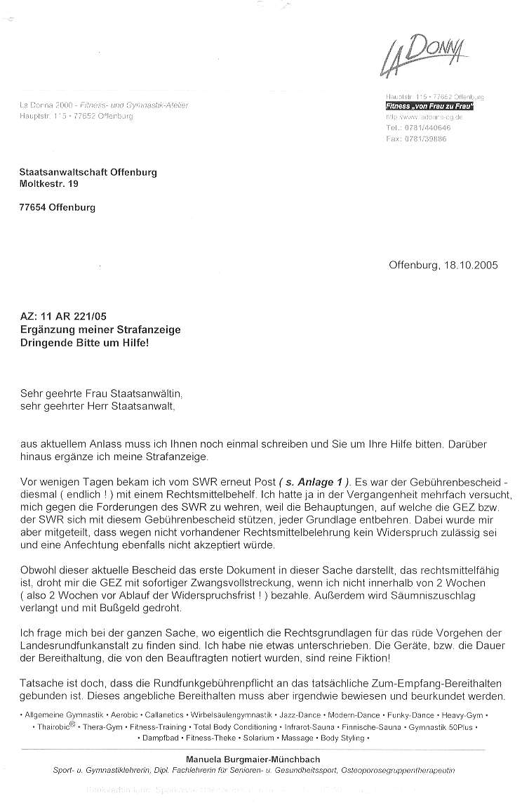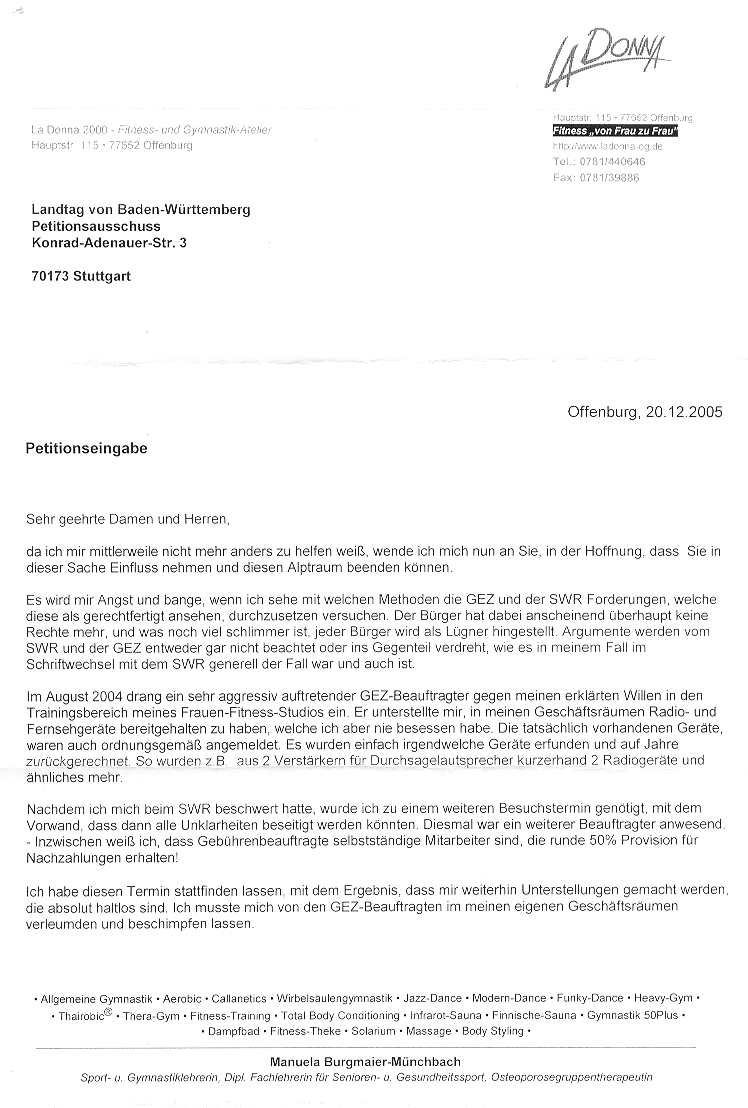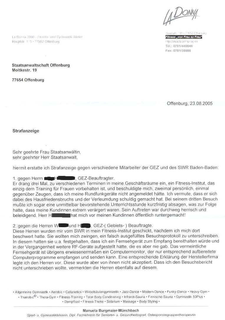 Frau Burgmaier-Münchbach betreibt das Fitness-Studio "La Donna 2000" in Offenburg, das nur Frauen Zugang gewährt. Sie zahlt seit je her ordnungsgemäß für die in ihrer Firma bereitgehaltenen Rundfunkempfangsgeräte. Trotzdem schickte die GEZ, bzw. der SWR mehrere Herren zum Abkassieren weiterer Geräte in ihre Firma. Dieser Fall wurde auch in der SAT.1 Sendung Akte 05/22 behandelt, in der ich auch ein paar Worte zum Thema GEZ gesagt hatte. Nach der Sendung habe ich mit Frau Burgmaier-Münchbach ausführlich gesprochen und mir den Schriftwechsel mit der GEZ bzw. mit dem SWR schicken lassen. Bei dem Auftreten der Gebührenbeauftragten, die in die Firma von Frau Burgmaier-Münchbach eindrangen, könnte es sich um strafbares Verhalten gehandelt haben (siehe weiter unten). - Dies zu prüfen ist Sache der Staatsanwaltschaft. Man sollte dazu wissen, dass Gebührenbeauftragte von eingetriebenen Nachzahlungen 40% plus Boni abbekommen (zusammen bis zu ca. 50%) oder keinen Cent erhalten, wenn sie keine Beute machen: