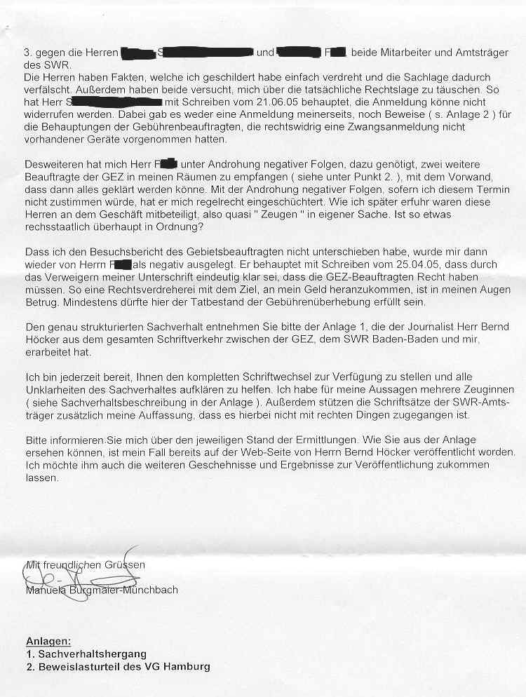 Einer genaueren Prüfung habe ich dagegen das Verhalten der internen Mitarbeiter des SWR unterzogen, die immerhin mit dem Gebühreneinzug eine hoheitliche Aufgabe erfüllen. Ich bin dabei zu der persönlichen Auffassung gekommen, dass selbst diese mit der Autorität des Staates ausgestatteten Sachbearbeiter bzw. Amtsträger nicht davor zurückschrecken, Straftaten zu begehen. Die ausführliche Begründung finden Sie weiter unten. Zusammenfassend lässt sich sagen, dass die Taktik der Rundfunkanstalten zu sein scheint: Erst falsche Behauptungen aufstellen, dann Verwirrung stiften und zum Schluss ungestört abkassieren. Am 23.8.05 hat Frau Burgmaier-Münchbach Strafanzeige bei der Staatsanwaltschaft Offenburg erstattet.