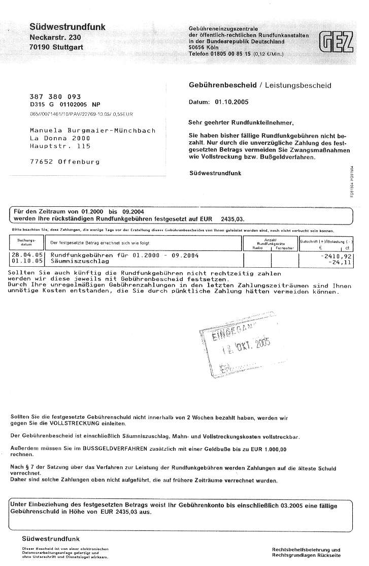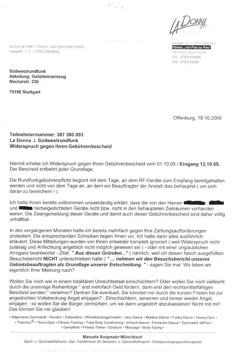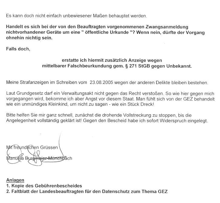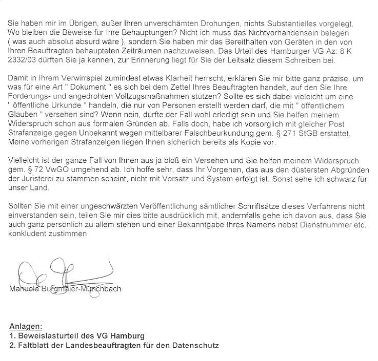 Frau Burgmaier-Münchbach legte zum wiederholten male Widerspruch gegen eine erneute Zahlungsaufforderungen der GEZ ein.