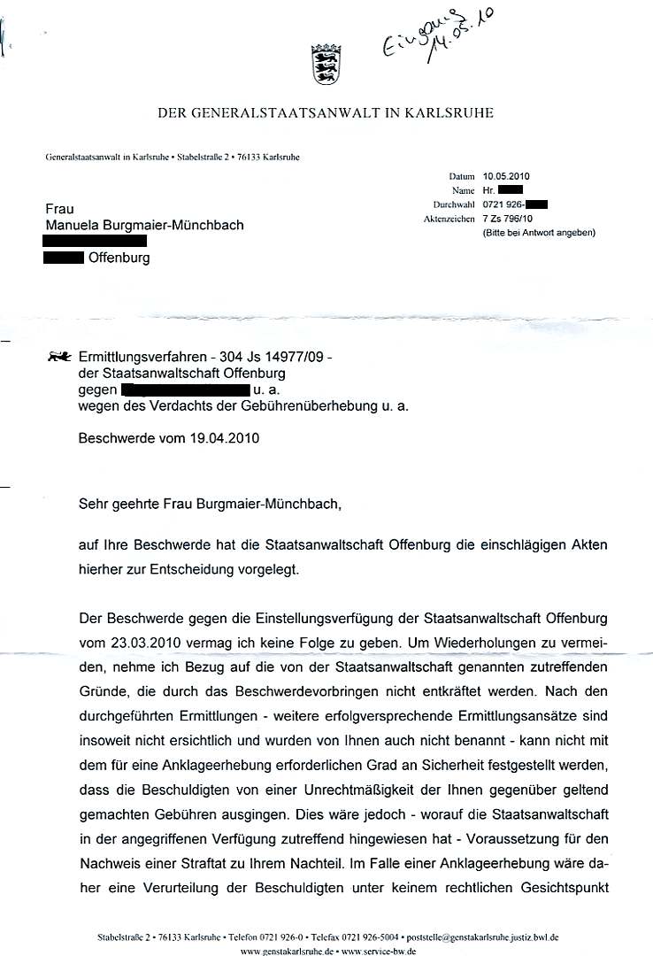 26. Juni 2010 Sehr schnell folgte nun die Antwort der Generalstaatsanwaltschaft: Mit keinem Wort wird dabei auf die Vorhaltungen reagiert, die Frau Burgmaier-Münchbach in ihrer Beschwerde formuliert hatte. Oder findet jemand was? Hier der Bescheid: