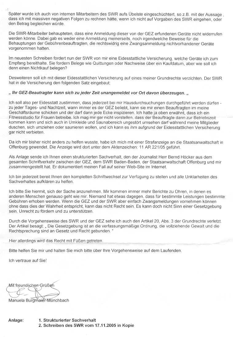 Am folgenden Sachverhalt lässt sich gut erkennen, dass es sich lohnt, gegen das Verhalten der Rundfunkanstalten mit Hilfe von Strafanzeigen und Veröffentlichungen vorzugehen: Statt mit 2.435,03 Euro gibt sich die Anstalt nun mit 96,90 Euro zufrieden, sofern allerdings die Strafanzeigen zurückgenommen werden und die Veröffentlichung über diesen Fall unterbleibt. So ging es in dem Fall weiter: Am 13.3.06 hat Frau Burgmaier-Münchbach durch ihren Anwalt Klage beim Verwaltungsgericht Freiburg gegen den SWR wegen seiner Gebührenforderung erhoben. Die Forderung des SWR gegen Frau Burgmaier-Münchbach belief sich zu diesem Zeitpunkt auf 2.435,03 Euro Der Petitionsausschuss hatte sich zwischenzeitlich leider nicht sehr intensiv um die Eingabe von Frau Burgmaier-Münchbach gekümmert. Nachdem der Ausschuss erfahren hatte, dass Klage eingereicht wurde, berief er sich darauf, nicht in ein laufendes Verfahren eingreifen zu dürfen. Bitte haben Sie dafür Verständnis, dass ich im Folgenden