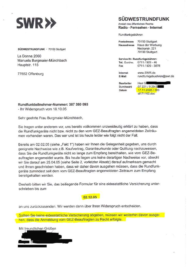 Da der Beauftragte ja immer Recht hat, solle sie beweisen, so Amtsträger F vom SWR, dass sie in den letzten vier Jahren die zwangsangemeldeten Geräte nicht zum Empfang bereit gehalten hat (wie bitteschön soll sie das machen - rückwirkend für die letzten vier Jahre...?). Auszug aus dem selben Schreiben: