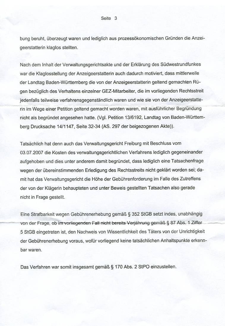 Der § 170 StPO lautet im übrigen wie folgt: StPO § 170 Wenn sie dagegen nun hätte vorgehen wollen, müsste sie einen Anwalt damit beauftragen. Das wäre aber eine sinnlose Geldverschwendung. Ich will das Vorgehen der Justiz an dieser Stelle nicht weiter kommentieren. Ich finde aber, dass ein derartiges Abwägen immer mehr zu einer inneren Kündigung vieler Bürger mit einem solchen Staat führt. Immerhin: Der "GEZ-Beleidiger" Schmidt muss ins Gefängnis. Welch ein Hohn für einen Rechtsstaat! Ich hatte mich ansonsten ja schon in meinem Blog dazu geäußert.