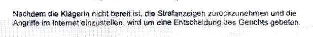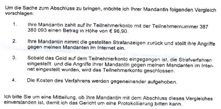 nicht alle Schriftstücke im Original abdrucken kann. Im Verlauf der Klage meldete sich auch die Staatsanwaltschaft mit Schreiben vom 19.7.06 bei Frau Burgmaier-Münchbach und teilte ihr mit, dass sie vor Ende des Verwaltungsverfahrens nicht tätig werden könne. Es wurde aber in verschiedenen Formulierungen darauf hingewiesen, dass der Fall überprüft werden würde, sobald ein Tätigwerden möglich sei. Das Schreiben der Staatsanwaltschaft leitete Frau Burgmaier-Münchbach am 27.7.06 an das Verwaltungsgericht weiter. Dieses hat es dann höchstwahrscheinlich auch zeitnah an die Beklagtenvertreter übermittelt (die Wahrscheinlichkeit ergibt sich daraus, dass Gerichte Schriftsätze der Gegenseite regelmäßig weitergeben). Bereits am 4.8.06 bekam der Anwalt von Frau Burgmaier-Münchbach einen Anruf der Beklagtenvertreterin mit der Ankündigung eines Vergleichs. Dieses Vergleichsangebot wurde dann mit Datum vom 16.8.06, also nur knapp 3 Wochen nach Absendung des Schreibens der Staatsanwaltschaft an das Verwaltungsgericht, in schriftlicher Form dem Anwalt von Frau Burgmaier-Münchbach übermittelt. Das schriftliche Vergleichsangebot lautete wie folgt: "Um die Sache zum Abschluss zu bringen, möchte ich Ihrer Mandantin folgenden Vergleich vorschlagen: 1. Ihre Mandantin zahlt auf ihr Teilnehmerkonto mit der Teilnehmernummer 387 380 093 einen Betrag in Höhe von 96,90. 2. Ihre Mandantin nimmt die gestellten Strafanzeigen zurück und stellt ihre Angriffe gegen meinen Mandanten im Internet ein. 3. Sobald das Geld auf dem Teilnehmerkonto eingegangen ist, die Strafverfahren eingestellt und die Angriffe Ihrer Mandantin gegen meinen Mandanten im Internet eingestellt wurden, wird das Teilnehmerkonto geschlossen. 4. Die Kosten des Verfahrens werden gegeneinander aufgehoben. Ich bitte Sie um eine Mitteilung, ob Ihre Mandantin mit dem Abschluss dieses Vergleiches einverstanden ist, damit ich das Gericht um eine Protokollierung bitten kann."
