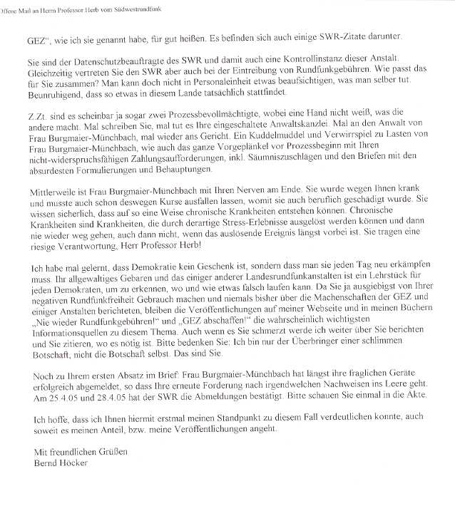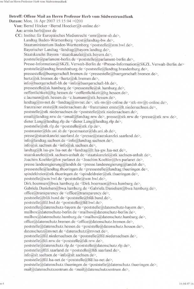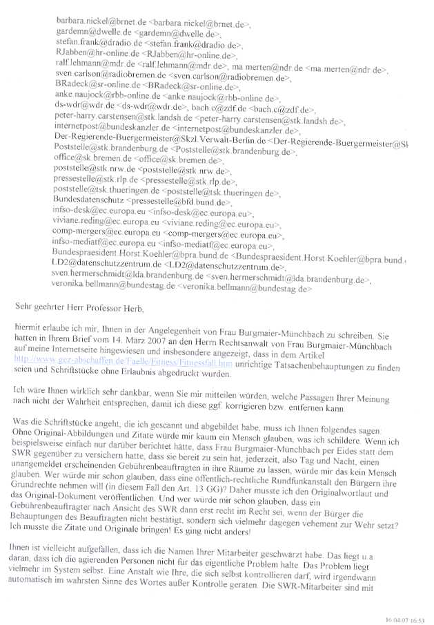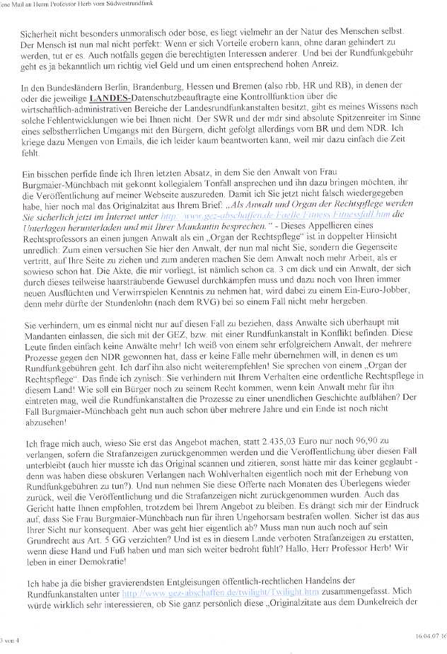 Die Forderung sollte also von 2.435,03 Euro auf dann nur noch 96,90 Euro reduziert werden, allerdings nur dann, wenn sie die Strafanzeige zurücknimmt sowie ihre Angriffe im Internet unterlässt. Die Fragen hierbei stellten sich wie folgt: Erstens: Warum haben die Mitarbeiter des SWR so eine Angst vor einer Strafanzeige, wenn doch alles mit rechten Dingen zugegangen sein soll? Und zweitens: Wie soll Frau Burgmaier-Münchbach einem Dritten (nämlich mir!) verbieten, etwas im Internet zu veröffentlichen? Gemeint sein dürften nämlich diese Veröffentlichungen hier auf meiner Webseite, da sonst keine "Angriffe" existieren. Dies ist nicht nur schlecht möglich, sondern darüber hinaus ein Angriff auf die Meinungs- und Pressefreiheit! Natürlich hat sie das Angebot abgelehnt, trotz der verlockenden Aussicht, mehr als 2.300 Euro zu "sparen". - Mir zu verbieten, über ihren Fall zu berichten, wollte sie nicht und die Strafanzeige hätte ohnehin nur zu einem gewissen Teil zurückgenommen werden können, da es sich zum anderen Teil um Offizialdelikte handelt, bei denen der Staatsanwalt auch ohne Anzeige tätig werden muss bzw. kann. Nach der Ablehnung dieses "Entgegenkommens" nahm die Beklagtenvertreterin des SWR ihr Vergleichsangebot wieder zurück und bestand nun auf einer Entscheidung des Gerichts. Nächster Schriftsatz des Gerichts an den Beklagten war die Empfehlung, der Beklagte möge sich jetzt doch an seine Zusage gem. Ziffer 1 des Vergleichsangebotes halten. Der SWR erbat daraufhin mit Schreiben vom 6.11.06 eine Bedenkzeit bis mindestens Ende des Jahres, woraufhin das Gericht die Frist zum 31.12.06 festsetzte (also fast zwei weitere Monate; wofür eigentlich?). Mittlerweile, mit Schreiben vom 21.3.07 ist das Angebot endgültig wieder zurückgezogen worden: Kurz zuvor, am 19. März 2007, kam ein Brief (mit Datum 14. März 07) vom Datenschutzbeauftragten des SWR, Herrn Prof. Dr. Armin Herb, an den Anwalt von Frau Burgmaier-Münchbach gerichtet. Leider darf ich diesen Brief des Herrn Prof. Herb nicht veröffentlichen, weil es sonst wohl Ärger gibt. Ich frage mich, warum die öffentlich-rechtlichen Rundfunkleute so öffentlichkeitsscheu sind... Diesen Brief habe ich am 16. April 07 in einer offenen Email beantwortet (ich hoffe, dass das wenigstens erlaubt ist): Textversion der Email ohne Adress-Briefkopf Textversion der Email ohne Adress-Briefkopf Hier finden Sie die Reaktion des Herrn Prof. Dr. Armin Herb auf diese Email!