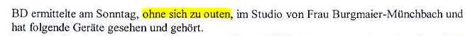 Frau Burgmaier-Münchbach beschwert sich daraufhin bei der GEZ, woraufhin diese einen weiteren Gebührenbeauftragten schickt (und zwar den Gebietsbeauftragten, der an der Beute mitverdient!), der bestätigt, dass die Geräte zwar tatsächlich nicht da seien, aber nur deshalb, weil Frau Burgmaier-Münchbach sie angeblich zwischenzeitlich entfernt habe. Er nimmt also die Abmeldung zum aktuellen Datum vor, behält allerdings die rückwirkende Anmeldung bei. Die erhobene zusätzliche Forderung bleibt dabei also erhalten. Frau Burgmaier-Münchbach protestiert und unterschreibt das Protokoll nicht. Diese nicht geleistete Unterschrift wird vom internen SWR-Mitarbeiter F (Name ist mir bekannt) zum Anlass genommen, in einer wohl nur in Diktaturen üblichen Logik zu behaupten, dass dann ja wohl der Beauftragte Recht haben müsse (weil sie es nicht bestätigt hat - hätte sie es bestätigt, dann hätte der Beauftragte natürlich auch Recht...! Er hat immer Recht!).
