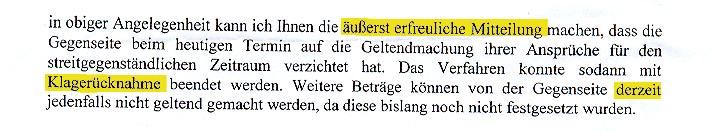 Ich werde jetzt erstmal eine Woche warten, bis ich einen nächsten Schritt gehe. Mal gucken, viielleicht sind die beiden ja tatsächlich bereit, zu helfen! 19. Juni 2009 Der Anwalt von Frau Schoen hat vor einem Monat über das Gericht einen weiteren Schriftsatz an den RBB geschickt, in dem er nochmal auf die Rechtslage verwies und die Unsinnigkeit der Forderungen plausibel gemacht hat. Auf die Beantwortung dieses Schreibens seitens des RBB möchte ich erstmal warten, bevor ich mich z.B. direkt an die Intendantin wende.