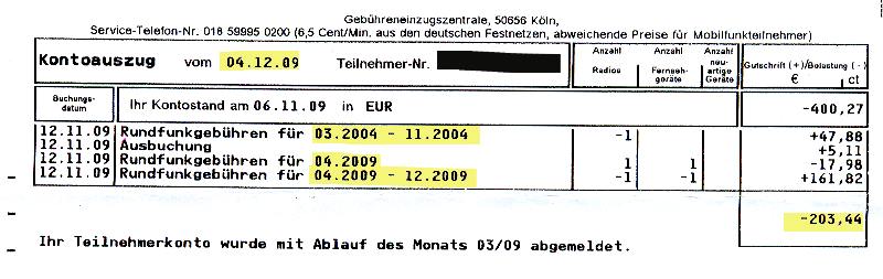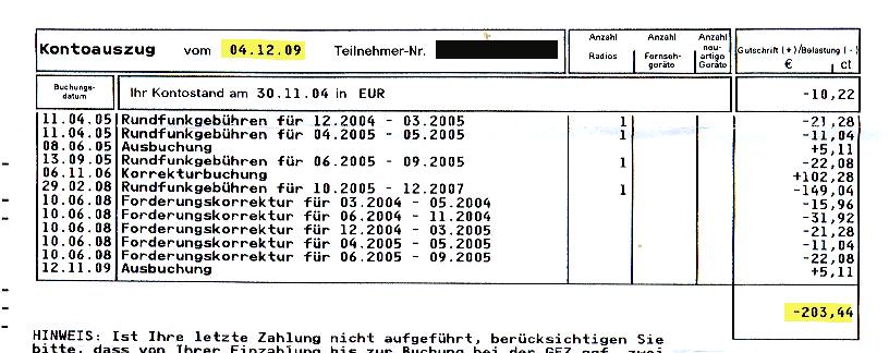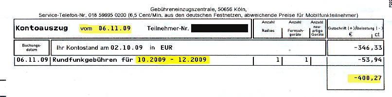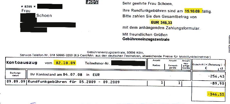 Aufgrund dieser Klagerücknahme hatte Frau Schoen also auch noch die Gerichtskosten zu tragen und würde weiter vom RBB gejagt werden. Ihr Anwalt hatte sie also verraten und verkauft (Achtung! =Meinungsäußerung (!!) von mir und von Frau Schoen). Und dann kam es, wie es kommen musste: Die GEZ schickte wieder Briefe an Frau Schoen! Zuerst einen Kontoauszug vom 2. Oktober 2009: