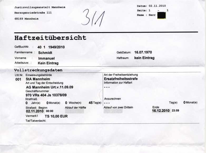 Die Haft hat er gemäß dieser Anweisung auch am 2. November 2010 angetreten. In der Haftanstalt wurde ihm dann auch noch folgendes Dokument überreicht: