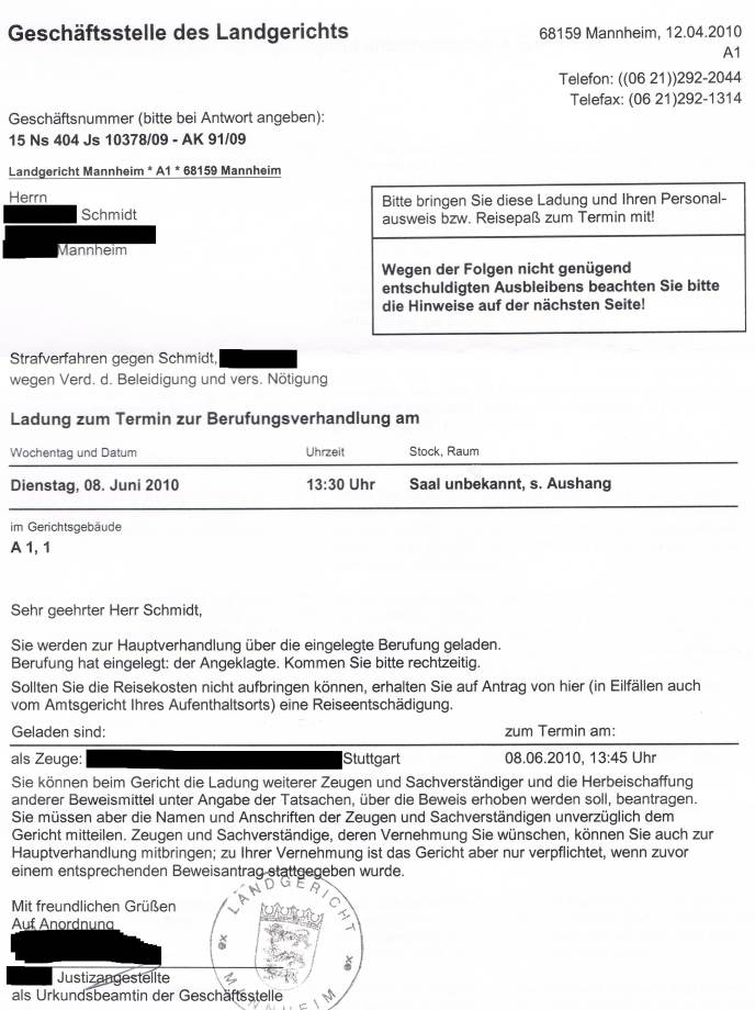 Da Herr Schmidt über kein Einkommen verfügt, müsste er 50 Tage ins Gefängnis. Er hat fristgerecht Einspruch erhoben und erhielt nun die Vorladung zur Hauptverhandlung. Übrigens: Der Strafbefehl wurde per Einwurf-Einschreiben, also ohne persönliche Übergabe und Unterschrift, zugestellt. Hätte sich der Postbote am Briefkasten geirrt, wäre Herrn Schmidt das Gefängnis sicher gewesen. Und Schmidts gibt es bekanntlich mehr als einen. Hier nun die Ladung, datiert vom 18.8.09: