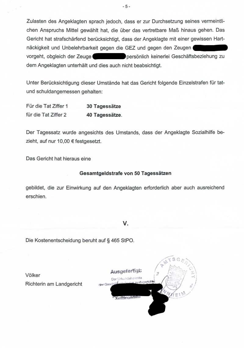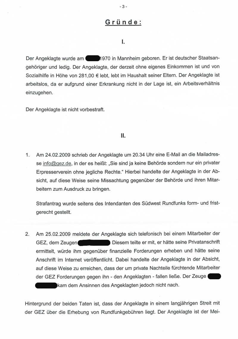 Betroffener ist diesmal ein Herr Schmidt aus Baden Württemberg und die Rundfunkanstalt ist diesmal eine andere, und zwar der SWR (das Ganze hat also System). Auch in diesem Fall geht es um einen lang andauernden Streit mit der Landesrundfunkanstalt und der GEZ. Hintergrund ist, dass Herr Schmidt wegen einer genetisch bedingten Krankheit dauerhaft arbeitsunfähig ist und über kein eigenes Einkommen verfügt. So musste er immer wieder Befreiungsanträge stellen, die mal genehmigt wurden und mal auch nicht. Einmal hatte er weder Harz 4 noch Sozialhilfe, weil die Behörden sich nicht einig waren. Höhepunkt des Streites war dann die Ablehnung seines Antrages mit der Begründung, dass ein geringes Einkommen nach der Neufassung des RfGebStV kein Befreiungsgrund mehr darstellt. D.h., selbst wenn jemand überhaupt kein Einkommen hat, muss er Rundfunkgebühren zahlen (dazu weiter unten mehr). Da Herr Schmidt zwischenzeitlich kostenpflichtige anwaltliche Beratung in Anspruch genonmmen hatte, stellte er dem zuständigen Mitarbeiter der GEZ per gerichtlichem Mahnbescheid eine entsprechende Rechnung über 45 Euro zu und forderte ihn auf, diese innerhalb von vier Wochen zu begleichen. Den Mahnbescheid schickte Herr Schmidt an die Privatadresse des GEZ-Mitarbeiters. Insgesamt lässt sich nach Durchsicht der Akte sagen, dass auch dieser Schriftwechsel nicht immer kühl und sachlich verlief. Die Rundfunkanstalt stellte auch in diesem Fall Strafanzeige und Strafantrag und zwar wegen Beleidigung und wegen versuchter Nötigung weil er den GEZ-Mitarbeiter mit der Geldforderung wegen seiner Anwaltskosten konfrontiert hat. Auch hier war die Staatsanwaltschaft fleißig: entgegen den sonstigen Gepflogenheiten wurde ermittelt und Anklage erhoben. Hier nun der Strafbefehl über 50 Tagessätze, den das zuständige Amtsgericht an ihn gerichtet hat (Eingang 3. August 2009):