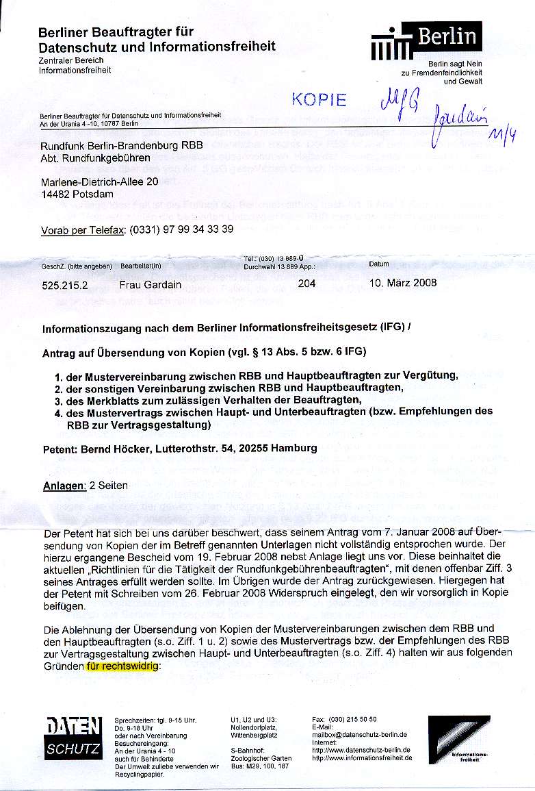 23. Februar 2008 Heute auch nur kurz: Zwischenzeitlich habe ich mehrere Emails an den rbb geschickt und den Berliner Beauftragten für Datenschutz und Informationsfreiheit eingeschaltet. Auch dieser hat sich sehr für meine Sache eingesetzt und nachgebohrt. Mittlerweile habe ich mit Datum vom 19. Februar 2008 (meine Anfrage war vom 7.1.08) einen Ablehnungsbescheid bekommen. Sobald ich wieder mehr Zeit habe, dokumentiere ich hier wieder die Schreiben. Bis dahin dürfte auch mein Widerspruch fertig sein. Sorry, dass ich heute so kurz angebunden bin. Es gibt aber in der anderen Sache Grund zum *Freuen*!