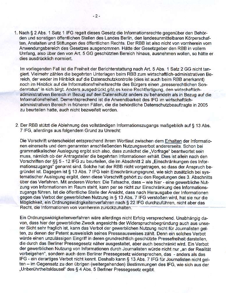 - VG 2 A 67.08 - In Sachen von Bernd Höcker, Lutterothstr. 54, 20255 Hamburg - Kläger - gegen den RBB, Masurenallee 8-14, 14057 Berlin - Beklagter - Klagebegründung Der Beklagte muss die von mir begehrten Unterlagen herausgeben. Die Rechtsgrundlage dazu bietet § 3 Abs. 1 i.V.m. § 2 Abs. 1 Berliner IFG sowie Art. 5 Abs. 1 und 3 GG. Das Auskunftsbegehren betrifft ausschließlich den wirtschaftlich-administrativen Bereich des RBB, nicht jedoch den Bereich der Programmgestaltung. Es handelt sich zudem nicht um personenbezogene Daten. Eine unmittelbare oder mittelbare Beeinflussung des Programms ist durch die pflichtgemäße Beantwortung meiner Anfrage nicht zu befürchten. Im vorliegenden Fall geht es in erster Linie um die Frage, ob der RBB überhaupt dem Berliner IFG unterliegt oder nicht. Das IFG regelt die Informationsrechte u.a. gegenüber den Behörden und sonstigen öffentlichen Stellen sowie u. a. den landesunmittelbaren Anstalten des öffentlichen Rechts. Diese Definitionen schließen nach Ansicht des Klägers auch den RBB mit ein. Landesunmittelbare Anstalten des öffentlichen Rechts sind nach § 28 Abs. 2 lit. c) des Allgemeinen Zuständigkeitsgesetzes auch solche, die durch Staatsvertrag der Staatsaufsicht des Landes Berlin unterstellt sind. Gem. § 35 RBB-Staatsvertrag gilt für den RBB das Recht des Landes Berlin; er untersteht nach § 39 RBB-Staatsvertrag auch der Aufsicht des Landes Berlin. Der RBB nimmt bei seiner Tätigkeit als gebührenerhebende Stelle hoheitliche Aufgaben wahr und handelt dabei wie eine Behörde, bzw. darf mit allen sich daraus für den RBB ergebenen Vorteilen handeln. Hierbei erlässt der RBB u.a. auch belastende Verwaltungsakte, die für den Bürger zum Teil von erheblicher Relevanz sein können. Der RBB bestreitet eine Auskunftspflicht nach dem IFG. Er beruft sich dabei in seinen Schriftsätzen vollumfänglich auf den Schutzbereich des Art. 5 Abs. 1 Satz 2 GG und führt an, aus diesem Grunde nicht zur Herausgabe der angeforderten Unterlagen verpflichtet zu sein. Diese Rechtsauffassung greift jedoch nicht. Der Vorgang der Gebührenerhebung findet im Vorfelde der Programmgestaltung statt und hat mit der späteren Verwendung der Gelder nichts zu tun. Es ist sehr wichtig, hier zwischen den verschiedenen Tätigkeitsbereichen der Rundfunkanstalten zu differenzieren, wobei die Erhebung der Rundfunkgebühren als staatlich einzustufen ist und keinen Einfluss auf die Programmgestaltung hat. Für eine Trennung einer von der Rundfunkfreiheit geschützten journalistisch-redaktionellen Tätigkeit und einer nicht vom Schutzbereich der Rundfunkfreiheit erfassten rein wirtschaftlich-administrativen Tätigkeit des RBB spricht im Übrigen auch die Tatsache, dass der Gesetzgeber selbst von einer solchen Trennung im RBB-Staatsvertrag ausgeht. So wird insbesondere bei den datenschutzrechtlichen Vorschriften der §§ 36 ff. RBB-Staatsvertrag zwischen der journalistisch-redaktionellen und der wirtschaftlich-administrativen Tätigkeit getrennt. Für letztere gelten die gleichen Datenschutzbestimmungen wie für jede andere öffentliche Stelle des Landes Berlin. Es ist daher nicht nachzuvollziehen, warum dies beim Recht auf Informationszugang anders sein sollte. Auch das BVerfG hat diese Differenzierung an verschiedenen Stellen vorgenommen. So heißt es in der BVerfGE 31, 314 vom 27. Juli 1971 (Zweite Rundfunkentscheidung), Rundfunkanstalten seien Einrichtungen des Staates, die Grundrechte in einem Bereich verteidigen, in dem sie vom Staat unabhängig sind. In der Entscheidung BVerfGE 59, 231 vom 14. Januar 1982 wird festgestellt, dass zwar Mitarbeiter, die unmittelbar mit der Programmgestaltung befasst sind, aufgrund der Schutzrechte des Art. 5 frei nach Ermessen der Rundfunkanstalt auf Dauer befristet oder unbefristet beschäftigt werden könnten (soweit also die Zubilligung dieser Schutzrechte). - Anders ist dies bei Mitarbeitern, deren Tätigkeit sich in der technischen Realisierung des Programms erschöpft und ohne inhaltlichen Einfluss auf das Programm bleibt. Während sich die Rundfunkanstalt somit gegen Regisseure, Redakteure und Drehbuchautoren durchsetzte, musste sie die Anstellung einer Geigerin, die lediglich sporadisch zu Vorführungen herangezogen worden war, akzeptieren. Anders als im vorliegenden Fall wurde hier sogar innerhalb des Programmbereichs nach maßgeblicher Mitgestaltung des Programms und der technischen Realisierung unterschieden. Es wird somit klar zum Ausdruck gebracht, dass der Schutzbereich des Art. 5 GG lediglich auf den gestalterischen Teil der Tätigkeit einer Rundfunkanstalt anwendbar ist und noch nicht einmal auf den technischen Bereich der Programmherstellung. Grundrechte sind ihrem Zweck nach Abwehrrechte des Bürgers gegenüber dem Staat. Auch wenn der Art. 19 Abs. 3 GG es ausnahmsweise zulässt, dass auch inländische juristische Personen Grundrechtsträger sein können, so darf dies jedoch nicht dazu führen, dass diese als Abwehrrechte gegenüber Bürgern verwendet werden. Die Grundrechte für diese Fallgruppen gelten auch nur, soweit sie ihrem Wesen nach auf diese anwendbar sind., so der genaue Wortlaut des Art. 19 Abs. 3. - Denn eine Ausdehnung der Grundrechtsfähigkeit auf juristische Personen des öffentlichen Rechts, welche nicht mehr von dem Zweck der Wahrung ihnen spezifisch zugeordneten Freiheitsrechte umfasst wird, wäre grundsätzlich mit dem primären Sinn der Grundrechte, den Schutz des Einzelnen vor Eingriffen staatlicher Gewalt zu gewährleisten, nicht mehr vereinbar. Sie könnte dazu führen, dass die Grundrechte in ihr Gegenteil verkehrt werden, und zwar dann, wenn Grundrechtsschutz zugunsten der öffentlichen Hand zu einem Schutz gegen die Bürger zu werden droht... (BVerfGE 59,231). Der Art. 5 GG steht generell für Offenheit und Informationszugang in einer freien Demokratie, nicht für Abschottung und Geheimniskrämerei. Es muss möglich sein, diesen Bereich deutscher Verwaltungstätigkeit ungehindert zu erforsche