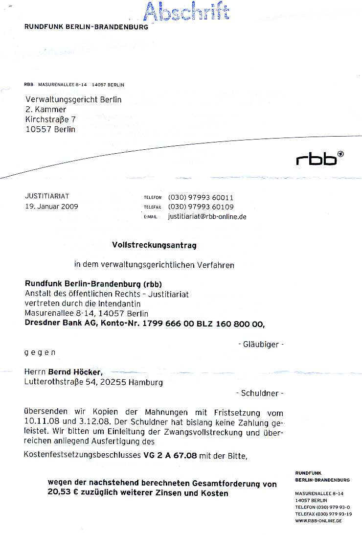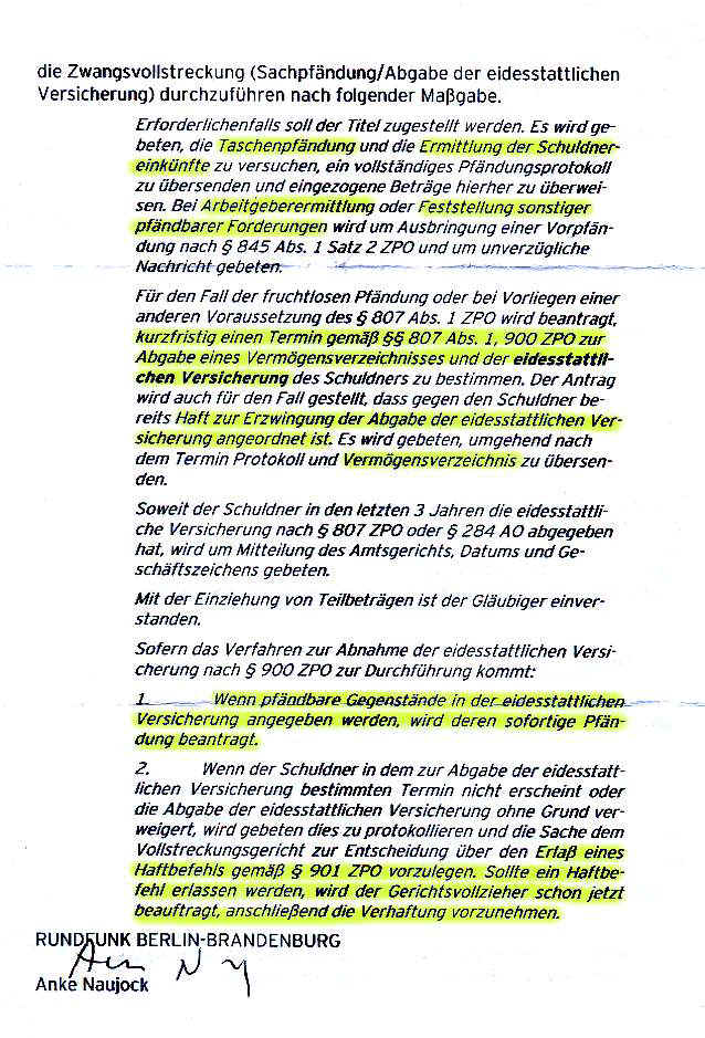 5. Februar 2009 Hätte sie das Geld für die Kopierkosten der von mir angeforderten Dokumente verlangt, hätte ich es umgehend überwiesen. Sie verlangt jedoch den gesetzlichen Höchstbetrag dafür, dass sie *Arbeit* damit hatte, die Presse in der Ausübung ihrer Aufgabe zu behindern. Sie hat *alles* dafür getan, das Grundrecht der Pressefreiheit des Art. 5 Abs. 1 Satz 2, 1. Alt. GG zu beschädigen! Und dafür, dass jemand Grundrechte verletzt, kann er nicht noch vom Geschädigten Geld verlangen! Dass meine Anfrage nicht rechtswidrig war, kann man allein am letzten Abschnitt vom 19. Dezember 2008 erkennen. Ich habe die Dokumente vollkommen legal und anstandslos von einer anderen Behörde erhalten. Hier nun das neue Schreiben von Anke Naujock: Sie beantragt beim Gericht im Namen des Rundfunks Berlin-Brandenburg u.a. folgendes: 1. Die Taschenpfändung 2. Die Ermittlung meiner Einkünfte 3. Die Ermittlung des Arbeitgebers 4. Termin für Offenbarungseid (heute Eidesstattliche Versicherung genannt) 5. Falls ich keinen Offenbarungseid ablegen möchte, soll Haftbefehl erlassen und meine Verhaftung vorgenommen werden.
