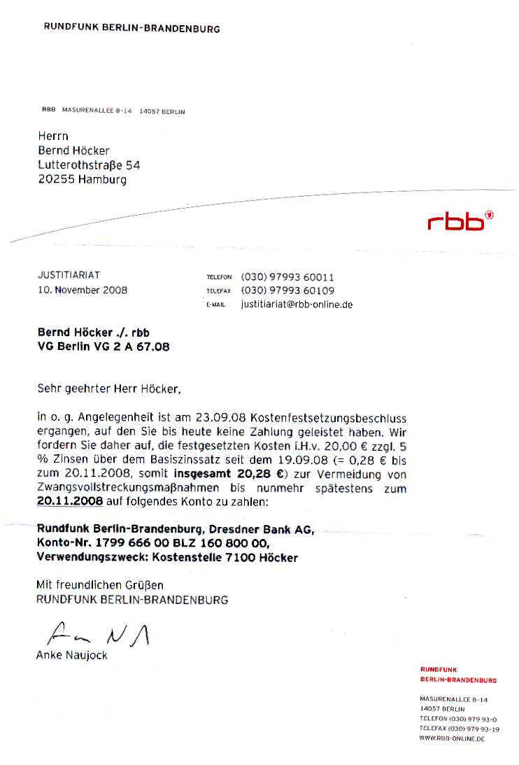 Tatsächlich hatte das Gericht auf Antrag von Frau Naujock dem RBB eine 20 Euro-Pauschale zugestanden, die ich zu zahlen habe - alles während meines Auslandsaufenthalts versteht sich (Eingang 16.10.08). Daraufhin hat Frau Naujock recht schnell mit *Zwangsvollstreckung* gedroht - wo sie doch ihre Klageerwiderung (einen 6-Zeiler) erst mit großer Verspätung eingereicht hatte. (Anke Naujock ist übrigens die "unabhängige" Datenschutzbeauftragte des RBB, die auch für die Geheimhaltung des Beauftragtendienstes zuständig ist) Ich könnte jetzt einen *Antrag* auf Wiedereinsetzung in den vorigen Stand nach § 60 VwGO stellen. Allerdings habe ich aber irgendwie keine Lust, wieder einen *Antrag* zu stellen und einen solchen Aufwand zu betreiben. Ich warte jetzt ab, wie und wann der *staatsferne* Staatsfunk seine Muskeln spielen lässt. Der RBB könnte um Amtshilfe beim NDR ersuchen, der mir dann seine Vollstreckerinnen und Vollstrecker ins Haus schicken würde. Ich könnte so eine Erfahrung gut für mein neues Buch Blockwart-TV gebrauchen, hoffentlich beeilen sich die Anstaltsleut' ein bisschen! Ich habe auch noch immer keinen Film über eine Zwangsvollstreckung für meine Fernsehsender H.A.S.E.L.-TV gemacht - das wäre ein echter Schulfunk-Knaller! Und dies dürfte DIE Gelegenheit dazu sein! 's wird Zeit, ich bin bereit! Zur Erinnerung: Es ging hier um eine harmlose Anfrage von mir bezüglich der Gebührenbeauftragten, die in einem *freiheitlichen Rechtsstaat* umgehend und problemlos beantwortetet worden wäre, weil Offenheit zu einen Prizipien gehört...!