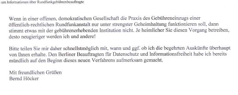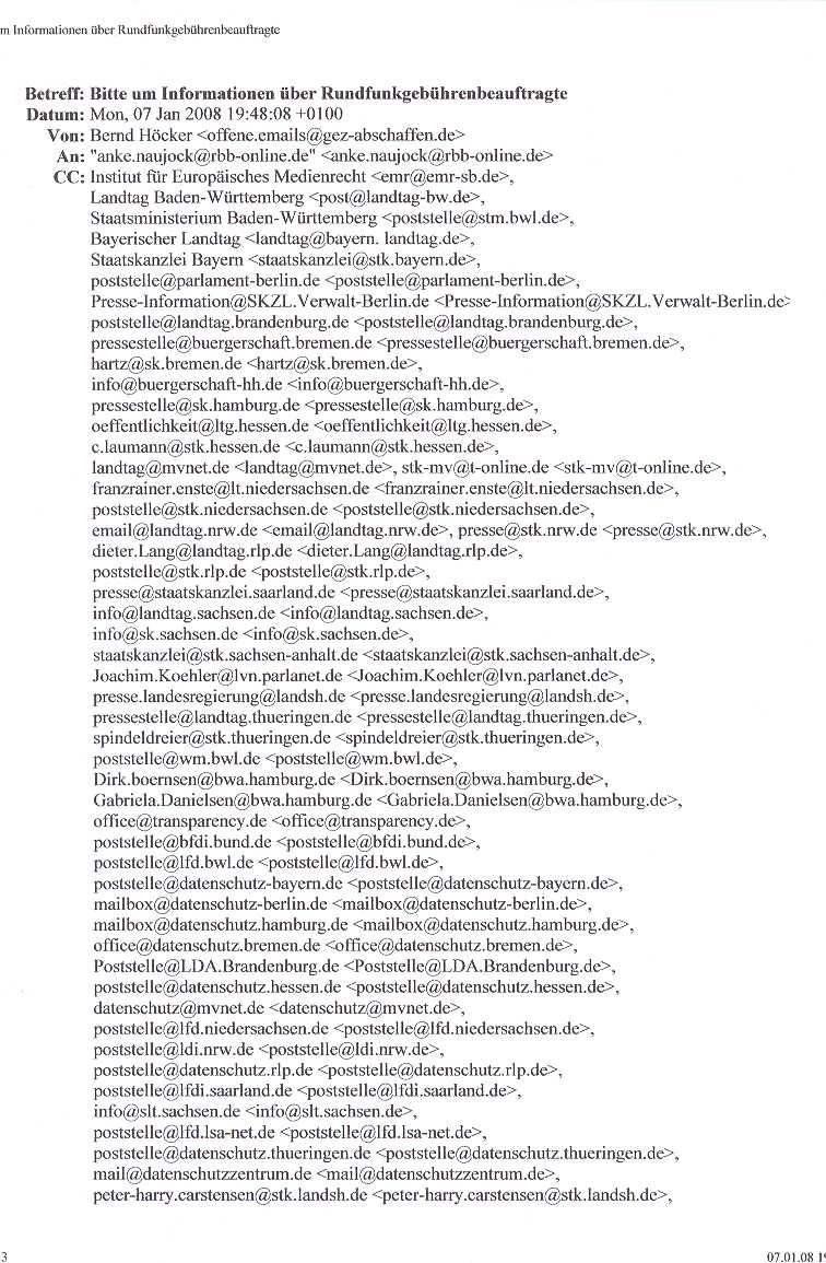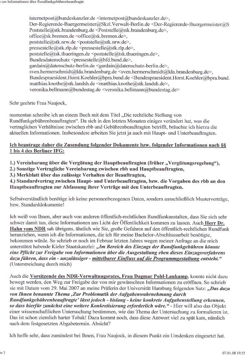 gerichtete Antworten bekommen, die in der Regel alles andere als zufriedenstellend waren. Später habe ich auch einiges davon dokumentiert. Selbst als die Universität Hamburg wegen meiner wissenschaftlichen Arbeit um die entsprechenden Informationen bat, wurde diese Bitte abgeschlagen. Der Rundfunkgebühreneinzug ist in Deutschland eben geheime Kommandosache. Damit die Welt diesmal an dem Vorgang teilhaben kann, führe ich hierfür nun ein neues Tagebuch. Und damit sich auch die relevanten öffentlichen Stellen mit dieser Problematik befassen können, habe ich diese mit einer Kopie bedacht. Auch mein kleiner aber feiner Presseverteiler ist natürlich wieder mit einer BCC dabei, da viele der Redakteure wahrscheinlich genau wie ich gespannt auf das Ergebnis sein werden... Ach ja, wer es nicht weiß: Frau Naujock ist die anstaltseigene Datenschutzbeauftragte des rbb (Radio Berlin Brandenburg). |