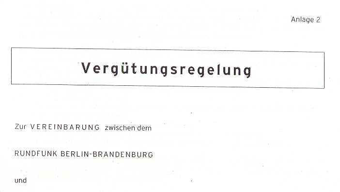 Dieser Fall dürfte doch noch mal richtig spannend werden! 19. Dezember 2008 Mittlerweile habe ich auch die wichtigsten *Dokumente* erhalten, die ich versucht hatte über den Klageweg zu bekommen. Nicht der RBB war so freundlich sie mir zu senden, sondern eine meiner sonstigen Quellen. Interessant sind dann auch die *Inhalte*, die ich für mein neues Buch analysieren und darstellen werde. Die Angst von Frau Naujock vor Veröffentlichung ist durchaus gerechtfertigt! Wenn ich solche Leichen im Keller liegen hätte, würde ich auch niemanden ins Haus lassen! Die beiden Dokumente sind die 5-seitige "Vergütungsregelung" zwischen RBB und seinen Hauptbeauftragten sowie der 6-seitige Vorschlag des RBB für Verträge zwischen Hauptbeauftragten mit ihren Unterbeauftragten: