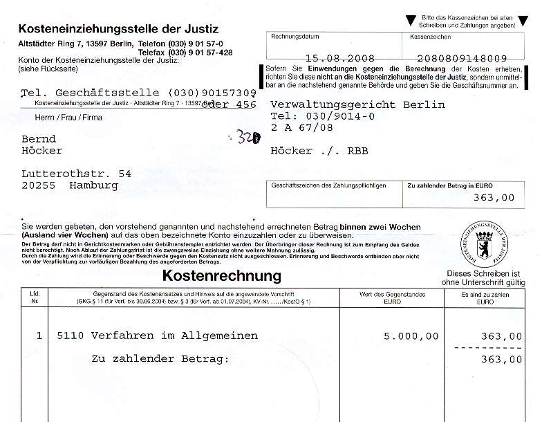 31. Juli 2008 Das ganze Zwischengeplänkel lasse ich hier mal aus, inkl. Widerspruch, Widerspruchsbescheid und ein mich unterstützendes Schreiben des Berliner Beauftragten für Datenschutz und Informationsfreiheit, das ebenfalls ohne den gewünshten Erfolg blieb. Hier nun gleich meine Klage vom 30. April 2008: |