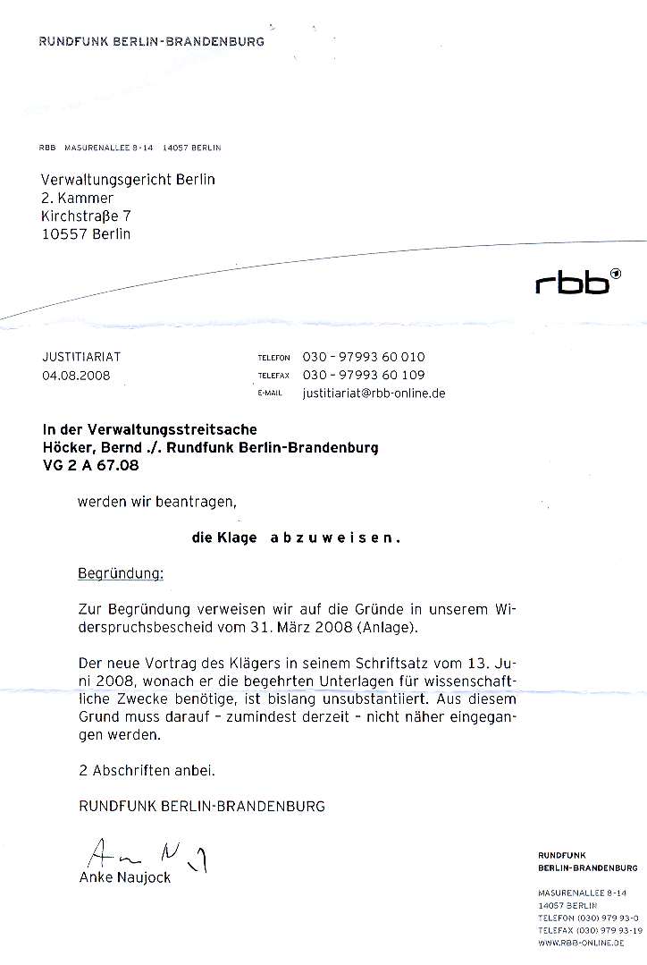 Wie mir das Gericht letzte Woche telefonisch mitteilte, hat der RBB die Frist zur Erwiderung meiner Klage verstreichen lassen. Jetzt wird die Akte erst wieder Ende September dem Richter vorgelegt. So kann man eine Klage auch tot-schmoren lassen. Irgendwann wird die Rundfunkgebühr sowieso abgeschafft, dann brauche ich die Unterlagen nicht mehr... 23. August 2008 Vor ein paar Tagen kam die Klageerwiderung des RBB und kurz danach auch die Rechnung des Gerichts für eine Vorauszahlung. Hier erstmal die Klageerwiderung, verfasst von der "unabhängigen" Datenschutzbeauftragten des RBB. Klein und schwach diese Erwiderung, wie ich finde...: