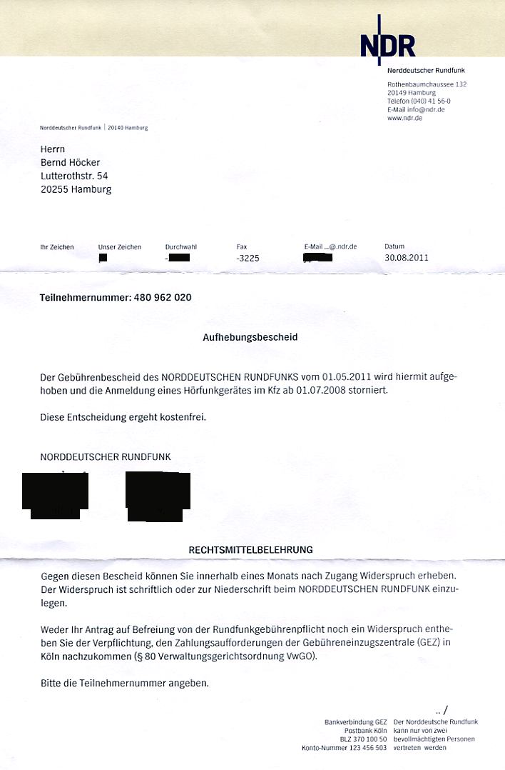 Mit Datum vom 30.08.2011 der Aufhebungsbescheid des NDR in der neuen Sache: