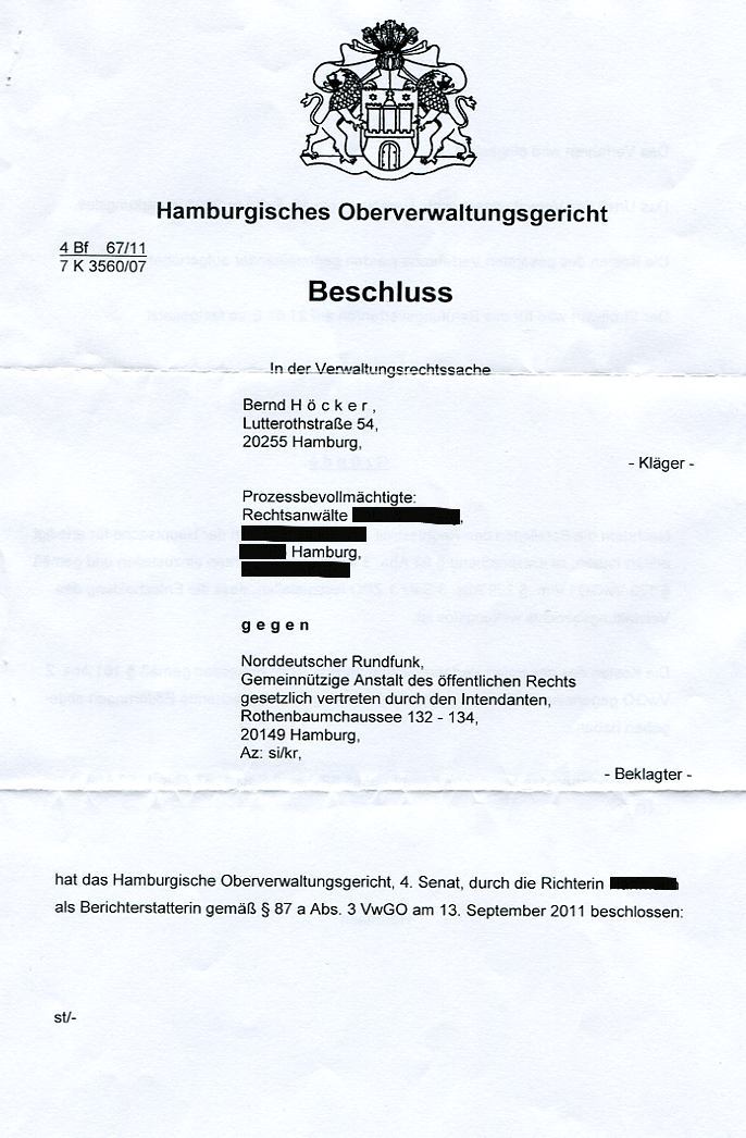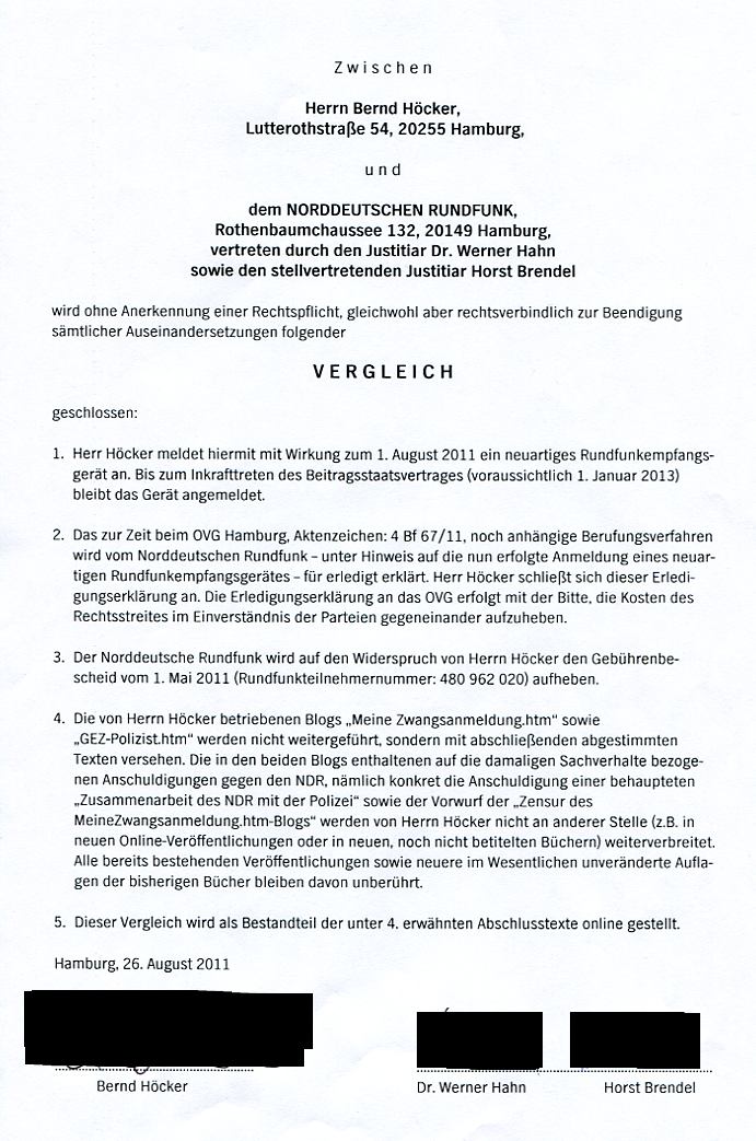 Am 26. August 2011 haben der NDR und ich zur Beendigung unserer seit über viereinhalb Jahren andauernden Streitigkeiten einen außergerichtlichen Vergleich geschlossen. Die Auseinandersetzungen waren ja in letzter Zeit so eskaliert, dass mittlerweile beide Seiten die Lust verloren hatten, stur und um jeden Preis an ihren ursprünglichen Kriegszielen festzuhalten. Betroffen von diesem Vergleich sind die folgenden beiden Blogs sowie die darin beschriebenen Verfahren gegen mich: Verhandelt habe ich ausschließlich mit dem (Chef)-Justitiar, Herrn Dr. Werner Hahn, in einer ausgesprochen angenehmen und konstruktiven Atmosphäre. Ausgangspunkte waren im wesentlichen die folgenden zwei Situationen: 1. Im OVG-Verfahren (MeineZwangsanmeldung.htm) stand mir die mündliche Verhandlung der Berufung bevor. In diesem Verfahren hatte ich ja ursprünglich in erster Instanz gewonnen. Die Berufung war dabei nicht zugelassen worden. Auf Antrag des NDR wurde die Berufung durch das OVG jedoch zugelassen, was als solches schon dafür sprach, dass die Richter der zweiten Instanz die Sachlage anders beurteilen würden, als die erste Instanz. Beim OVG herrscht außerdem Anwaltszwang und ich hatte mit der Anwältin einen Streitwert von 10.000 Euro vereinbart, nach dem sich ihre Gebühren richten sollten. Der tatsächliche, vom Gericht festgelegte Streitwert betrug lediglich 21,67 Euro. Für die Anwältin hatte ich gleich zu Beginn einen Betrag von 775,64 Euro für die sog. Verfahrensgebühr (inkl. Portopauschale und Mwst) zahlen müssen. Wäre ein Termin für eine mündliche Verhandlung anberaumt worden, kämen noch einmal eine sog. Terminsgebühr von 694,01 Euro (inkl. Mwst) hinzu [Hier nachzurechnen]. Selbst wenn ich gewonnen hätte, bekäme ich nur die Anwaltskosten vom NDR erstattet, die sich nach dem tatsächlichen Streitwert richten. Das wären 40,- Verfahrensgebühr und 30,- Terminsgebühr. Hätte ich verloren, kämen zusätzlich noch Rundfunkgebühren rückwirkend bis 1.1.2007 hinzu. Kurz gesagt: Eine Weiterführung des Verfahrens wäre für mich in jedem Fall ein schlechtes Geschäft gewesen und zusätzlich noch mit erheblichem negativen Stress verbunden. 2. Im neuen Zwangsanmeldeverfahren (GEZ-Polizist.htm) war es wohl für den NDR etwas schwierig geworden. Die Sache mit dem bereits im Mai 2009 verkauften Auto und die zumindest missverständlichen Formulierungen im Anschreiben des NDR vom 9.12.2010 an mich, schafften dann tatsächlich Raum für ein Innehalten.