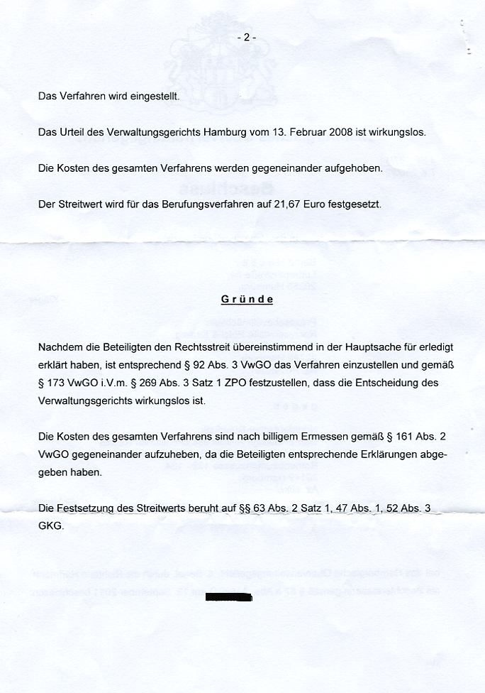 Mit Datum vom 17. September 2011 (Eingangsdatum bei mir) der Einstellungsbeschluss des OVG in der alten Sache: