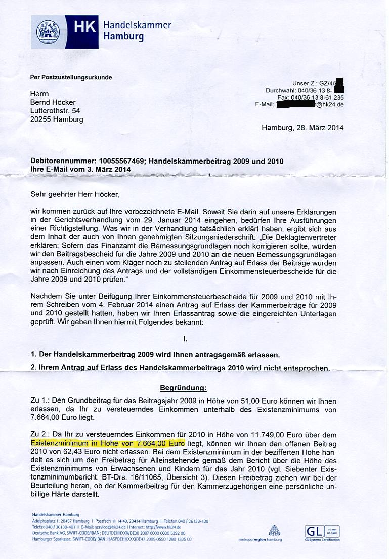 Sehr geehrter Herr Melsheimer, sehr geehrter Herr Prof. Dr. Schmidt-Trenz, wie aus dem letzten Schreiben Ihrer Mitarbeiterin hervorgeht, legen Sie es auf eine längerfristige Konfrontation mit mir an. Ich habe daher auf meiner Webseite einen Blog angelegt, den Sie unter der Adresse http://www.gez-abschaffen.de/handelskammer/index.htm ständig aktualisiert finden. Dort finden Sie dann alle Schriftsätze, die wir künftig miteinander austauschen werden sowie weitere Kommentare von mir zum aktuellen Stand des weiteren Verfahrens. Nach einer Entscheidung des Bundesverfassungsgerichts vom 18. Februar 2010, Az 1 BvR 2477/08, ist es mir erlaubt, auch Ihre Schriftsätze unzensiert abzudrucken. Bernd Höcker PS: Merkwürdig, dass Sie als Führungspersonen keine eigenen Email-Adressen haben, sondern lediglich unter service@hk24.de zu erreichen sind. Da könnte doch mal eine Mail verloren gehen oder.... - Ich habe nun ein paar Kopien an weitere Empfänger geschickt - auch in der Hoffnung, dass irgend jemand die Mails schon an Sie beide weiterleiten wird. Erklärung Hiermit erkläre ich, Bernd Höcker, nach bestem Wissen und Gewissen, dass sich meine Tätigkeit wie folgt zusammensetzt: 1.) Als Buchautor und Journalist recherchiere und schreibe ich Bücher, Artikel und Blogs, die ich auch selber bearbeite und für den Druck gestalte. Ich mache als Autor praktisch die komplette Arbeit. 2.) Als Verleger habe ich sämtliche verlegerischen Tätigkeiten an andere Firmen übertragen. Der Druck wird von der Druckerei durchgeführt. Diese sendet die Bücher nach Fertigstellung an meine Verlagsauslieferung. Dort werden die Bücher gezählt und gelagert. Alle eingehenden Bestellungen gehen an die Verlagsauslieferung, die auch die Rechnungen ausstellt und sämtliche Verwaltungsaufgaben übernimmt. Ich erhalte dann jeweils am Ende eines Monats lediglich eine Abrechnung und eine Überweisung. Dem Verlag entstehen durch die Inanspruchnahme der Serviceleistungen also überwiegend Kosten. Aus dieser Gesamtbetrachtung schätze ich das Verhältnis der Gewinne aus beiden Bereichen auf ca. 90% als Freiberufler und 10% als Gewerbetreibender. Bernd Höcker |