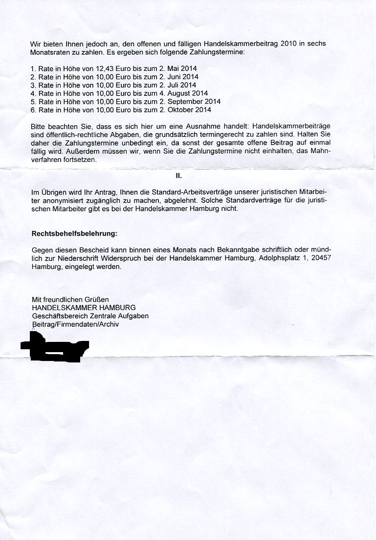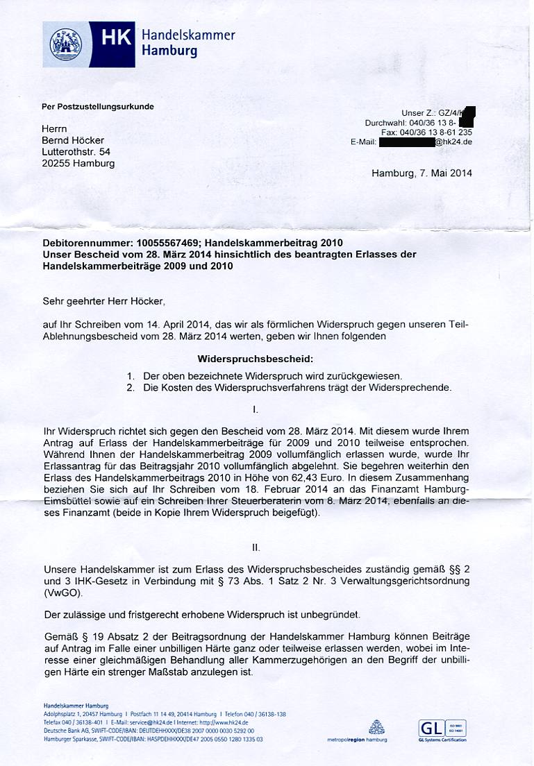 23. Mai 2014 Hier auch nochmal kurz der Hinweis, dass ich zwischenzeitlich vier Wochen zur Kur war und ich daher erst jetzt dazu komme, den Blog fortzusetzen. Wer die Offene Email noch nicht kennt, in der die Sache in Kurzform dargestellt wird, klicke bitte [Hier]. Wer direkt zu der Textstelle nach vorne springen möchte, an der ich meine (voraussichtliche!) Strategie bekannt gebe, klicke [Hier]. Hier nun das Schreiben der Handelskammer als Reaktion auf meine Offene Email: |
