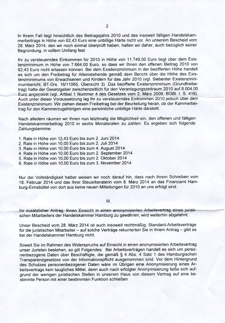 Zu II. Ich bestehe nach wie vor auf Einsicht in einen anonymisierten Arbeitsvertrag für Ihre mit der Beitragseintreibung befassten Juristen. Sie sind gem. dem HambTG verpflichtet, mir ungehindert Zugang zu den entsprechenden Unterlagen zu geben.